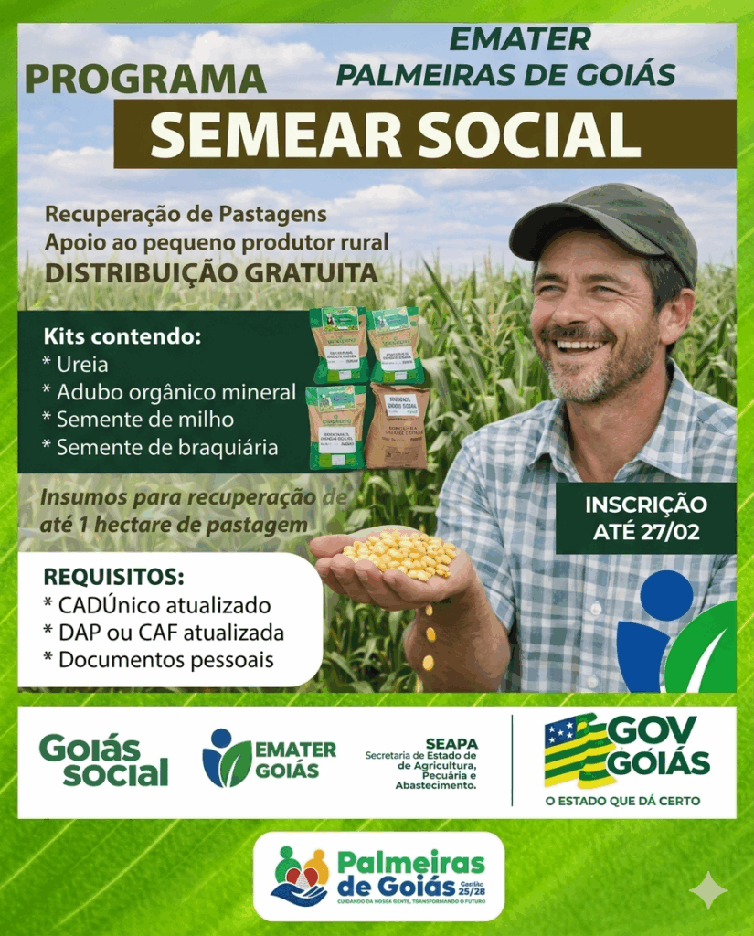 Atenção, Pequeno Produtor Rural: Prazo para inscrições no Programa Semear Social em Palmeiras de Goiás termina nesta sexta-feira (27)