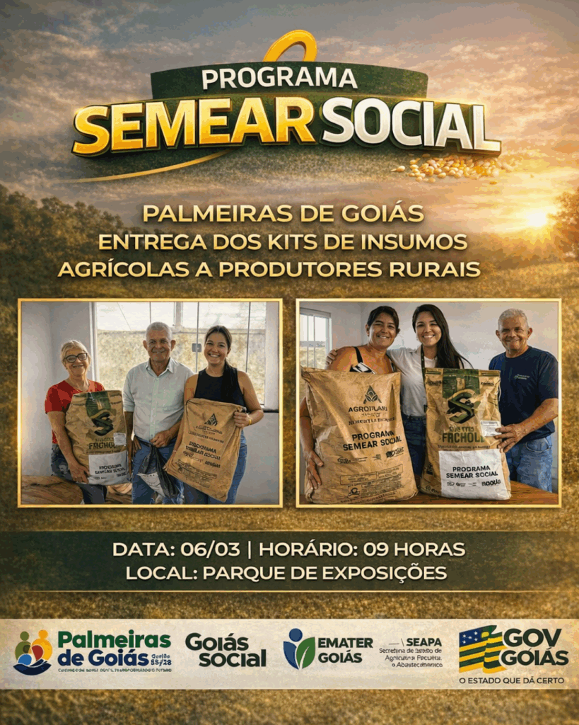 O pequeno produtor rural de Palmeiras de Goiás que realizou inscrição no Programa Semear Social, da Emater Goiás, deve ficar atento: a entrega dos kits acontece nesta sexta-feira (06/03), às 9 horas, no Parque de Exposições do município.