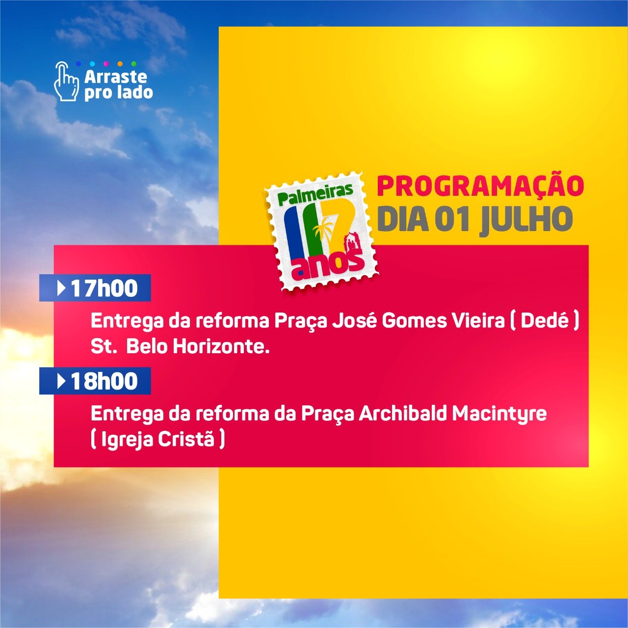 A semana do aniversário de Palmeiras de Goiás está repleta de grandes eventos e importantes inaugurações de obras para à população. Venha festejar conosco estas conquistas esperadas a décadas por todos nós.