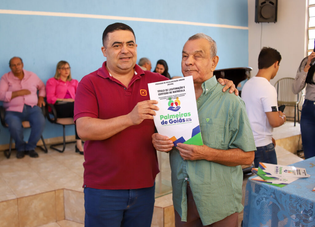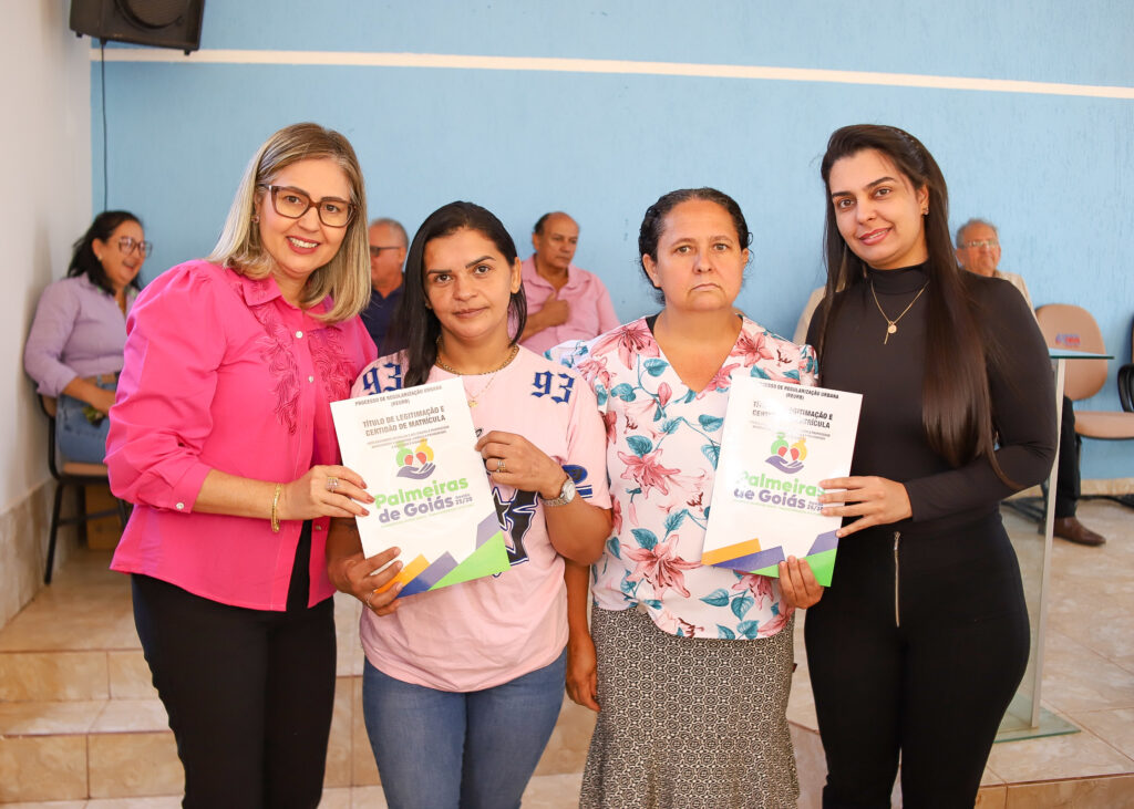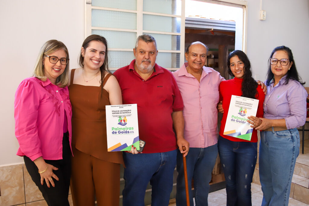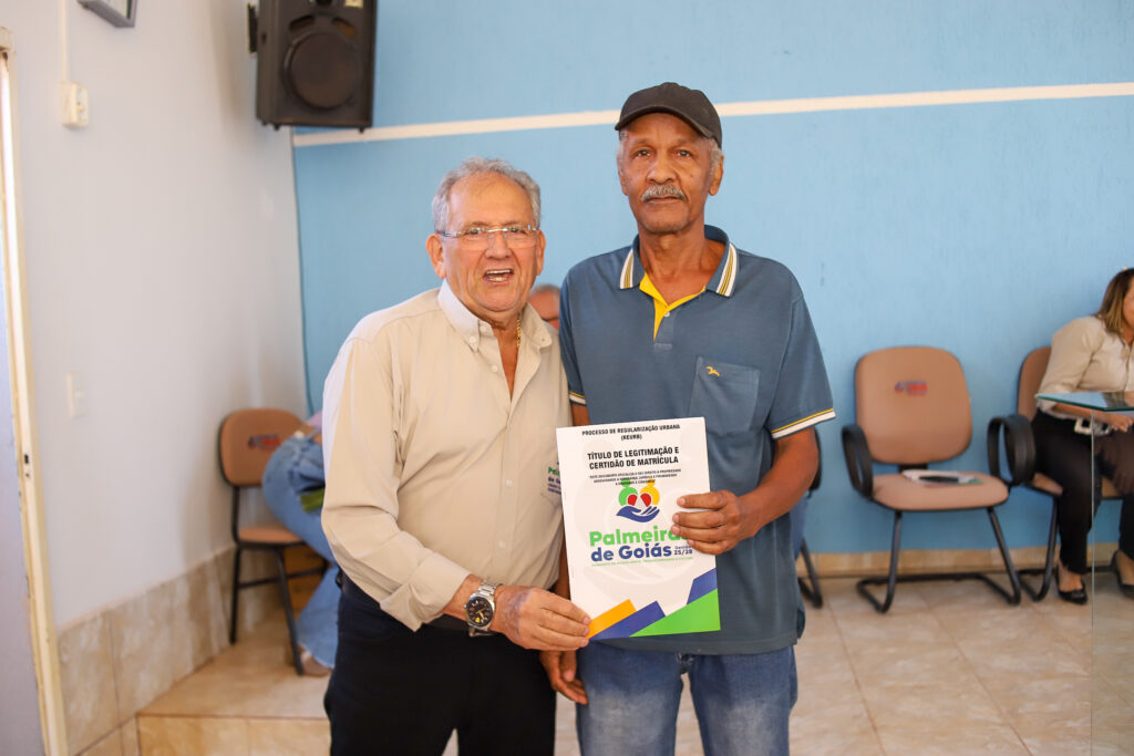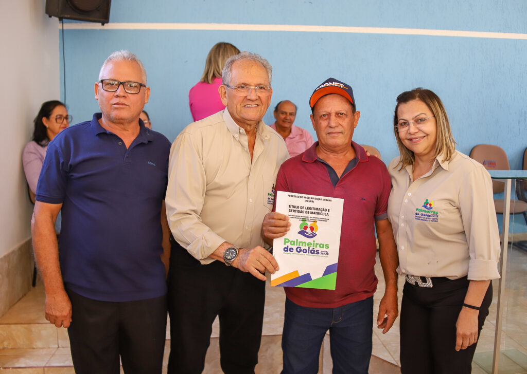 A Prefeitura de Palmeiras de Goiás, por meio da Secretaria Municipal de Cidadania, realizou nesta segunda-feira (20/10) a entrega das escrituras e a conclusão do processo de regularização fundiária (REURB) do Povoado do Poço D’Água, beneficiando 20 famílias e duas entidades religiosas — a Paróquia São Sebastião e a Igreja Assembleia de Deus.