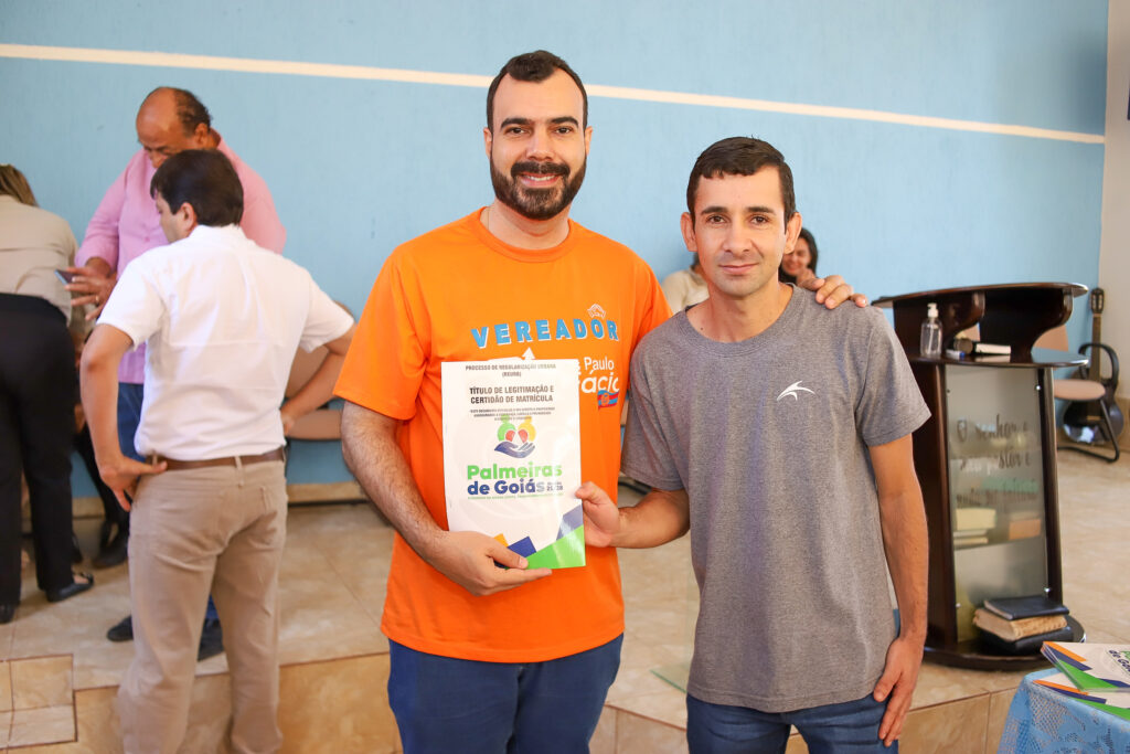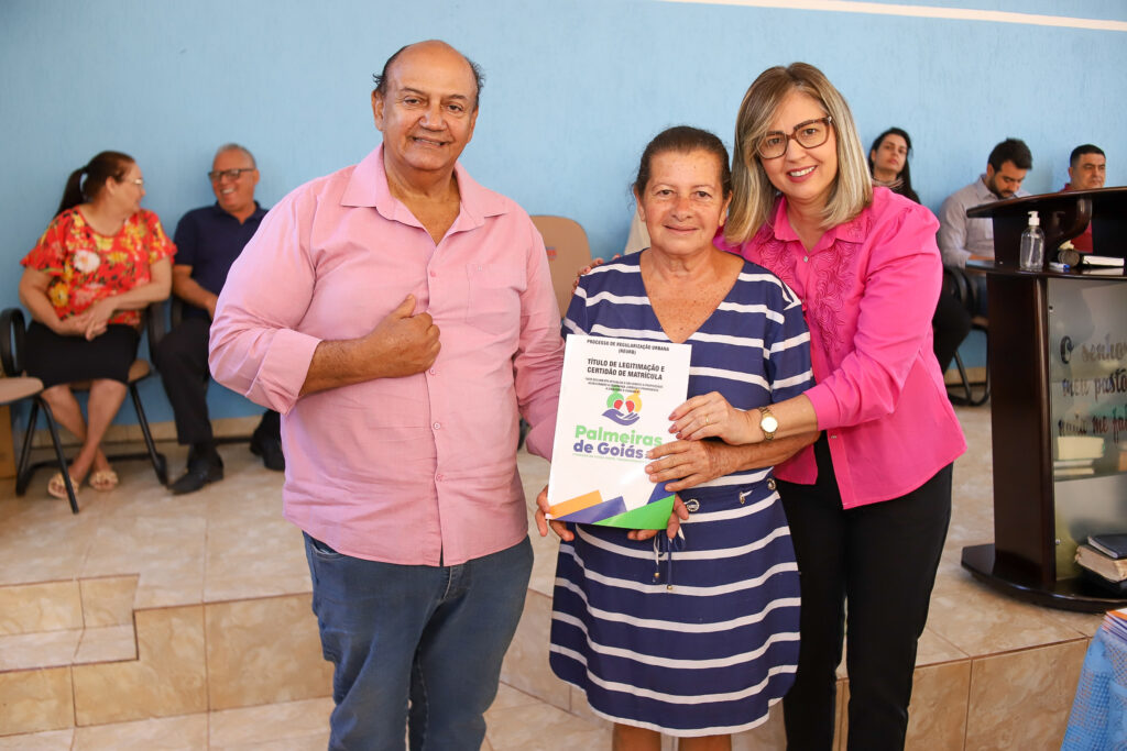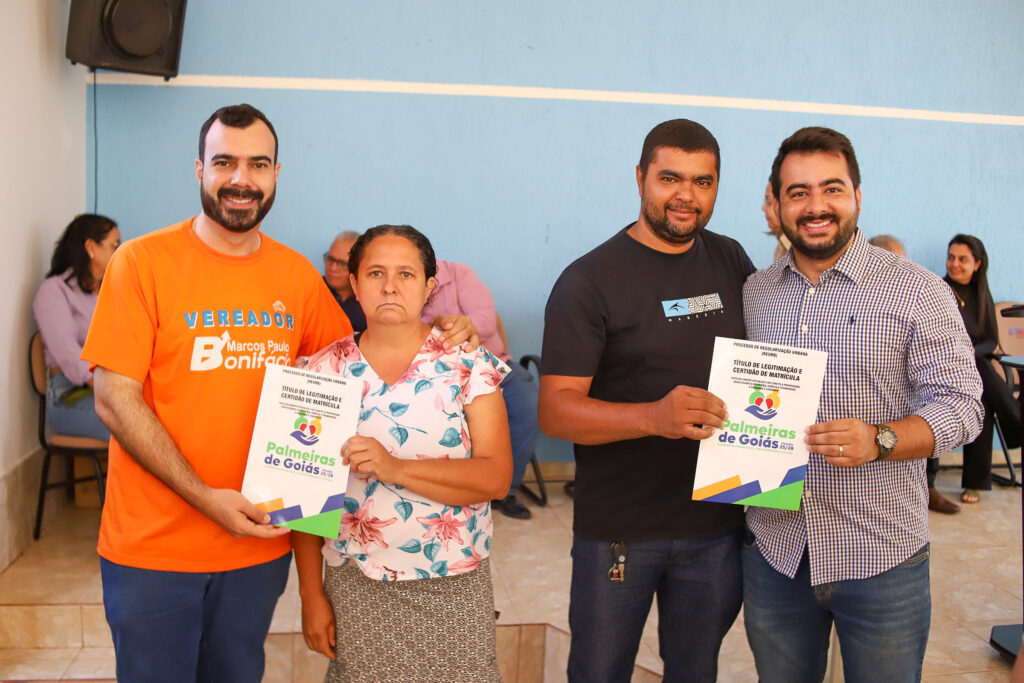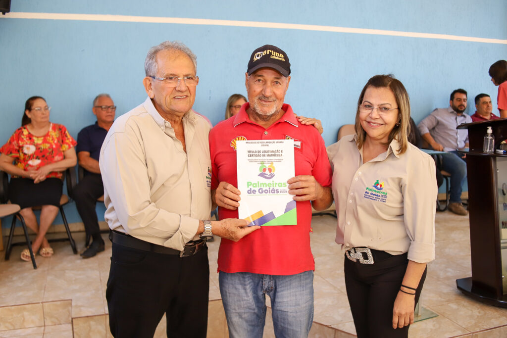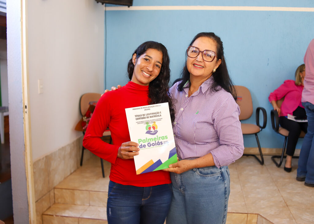A Prefeitura de Palmeiras de Goiás, por meio da Secretaria Municipal de Cidadania, realizou nesta segunda-feira (20/10) a entrega das escrituras e a conclusão do processo de regularização fundiária (REURB) do Povoado do Poço D’Água, beneficiando 20 famílias e duas entidades religiosas — a Paróquia São Sebastião e a Igreja Assembleia de Deus.