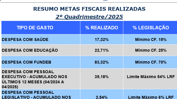 O secretário de Economia Welsom Macedo destacou que os índices foram cumpridos e as metas fiscais alcançadas. “A administração municipal está trabalhando com muita responsabilidade e transparência na gestão dos recursos públicos. Essa é uma obrigação constitucional, onde a cada quadrimestre o Poder Executivo precisa mostrar suas contas e, nesse caso, estamos trazendo dados do segundo quadrimestre e cumprindo o que foi estabelecido pela Casa Legislativa no ano passado, para 2025”.